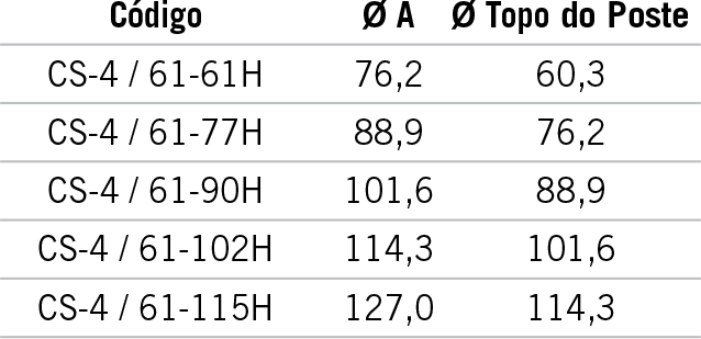 Centros-suporte – fabricados em tubos de aço com diversos diâmetros para montagem em topo de poste reto e fixação por meio de parafusos de aperto. Provido(s) de segmento(s) para receber luminária(s) com encaixe de 60,3mm de diâmetro inclinado(s) com ângulo de 5º com relação à horizontal, em diversas configurações. Fechada por tampa removível repuxada em chapa de alumínio. Acabamento superficial revestido com zinco por imersão a quente conforme NBR 6323/90.