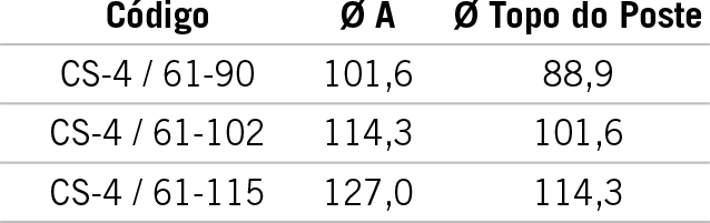 Centros-suporte – fabricados em tubos de aço com diversos diâmetros para montagem em topo de poste reto e fixação por meio de parafusos de aperto. Provido(s) de segmento(s) para receber luminária(s) com encaixe de 60,3mm de diâmetro inclinado(s) com ângulo de 5º com relação à horizontal, em diversas configurações. Fechada por tampa removível repuxada em chapa de alumínio. Acabamento superficial revestido com zinco por imersão a quente conforme NBR 6323/90.